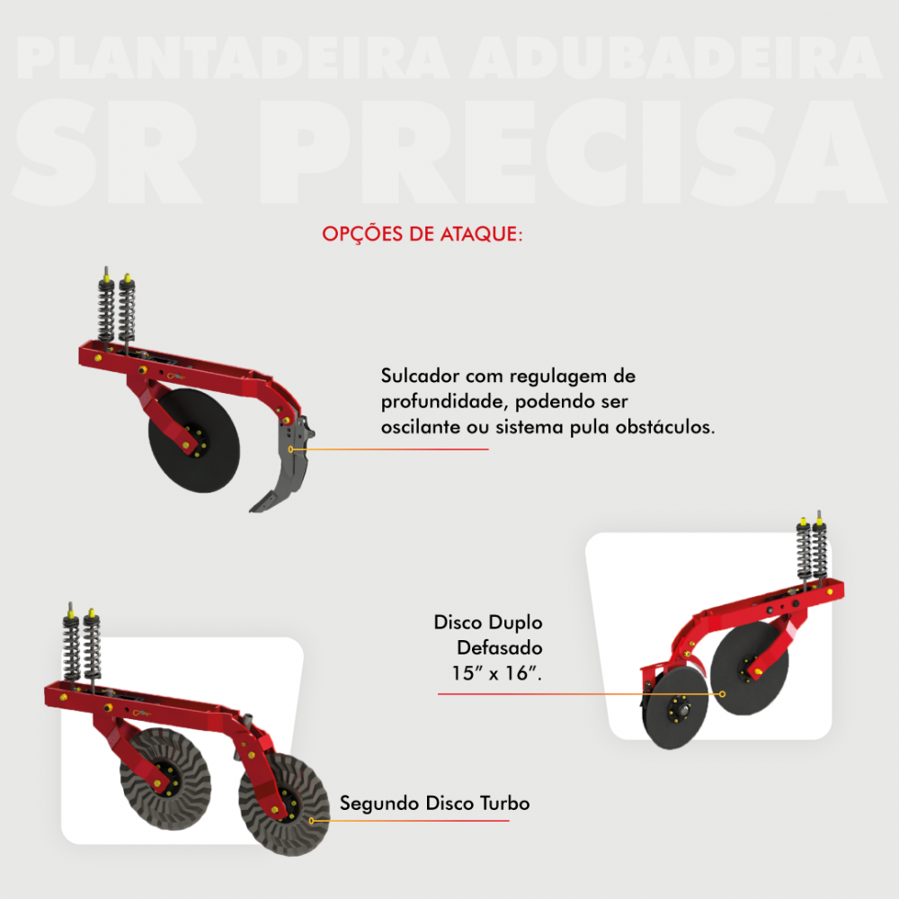 • Molas de pressão no disco de corte e sulcador na frente da linha facilitando a regulagem;
